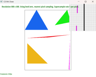 We use a three line test to check if a point was inside the triangle. To do the three line test, we defined the line as two planes such that if L(x, y) > 0, then it’s above the line, = 0 on the line, and < 0 is below the line. With the line test along with the correct ordered pair of coordinates, we can check that a point is inside the triangle and on the edge of the triangle by setting L(x, y) >=0. Doing this to all three sides of the triangle and if all three returns true, then it means the point is inside the triangle. If a point is inside the triangle, then we use sample_buffer to set the color of the pixel. Our algorithm is the same as the one that checks each sample within the bounding box of the triangle which we use min{x0, x1, x2} as lower bound of x and max{x0, x1, x2} as the upper bound of x. Then, we use min{y0, y1, y2} as the lower bound of y and max{y0, y1, y2} as the upper bound of y.
