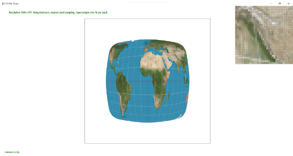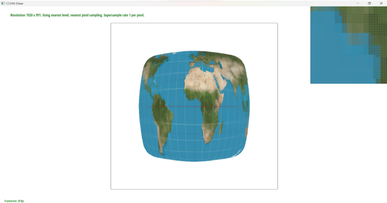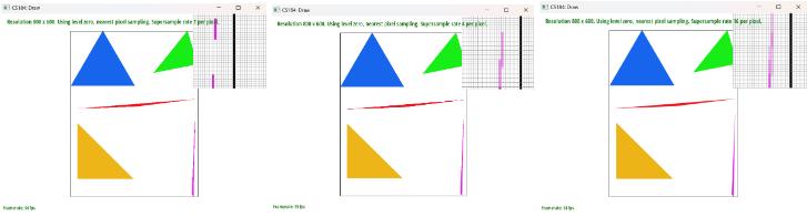 We first use a width*height*sample_rate as our basic data structure for supersampling. Within the supersampling array, we decided to have the sampling of 1 pixel consecutively. We were able to do this with the following equation, (y*width + x)*sample_rate + m + (n*sqrt(sample_rate)), y as # of pixel downwards, x as # of pixel to the right, m as # of pixels to the sample within a pixel, and n as the number of samples downwards within a pixel all with 0 indexing. In order to do the supersampling, we had a for loop that would go through each pixel within the bounding box of the triangle and within each pixel, we created a for loop to sample at the sampling rate with sqrt(sample_rate)*sqrt(sample_rate). In order to check that a sample is within a triangle, we set the first sample as 1/(2*sqrt(sample_rate)), then after each iteration of the for loop, we would add it by 1/(sqrt(sample_rate)) such that it can check for the next sample. We used the inside function to check if the sample is inside the triangle, and if it is, then we use the following formula to set the color: (y*width + x)*sample_rate + m + (n*sqrt(sample_rate)). For averaging down, we collected the sum of the colors for the sample within the pixel, then dividing it by the sample_rate, and finally multiplying it by 255 to resolve to framebuffer. Supersampling is very useful for getting rid of jaggies because it does not work with 1 single color, but also it works with sample_rate colors which makes jaggies more natural. Having a higher sample_rate works well to antialias the triangles as it works well to make smoother jaggies.