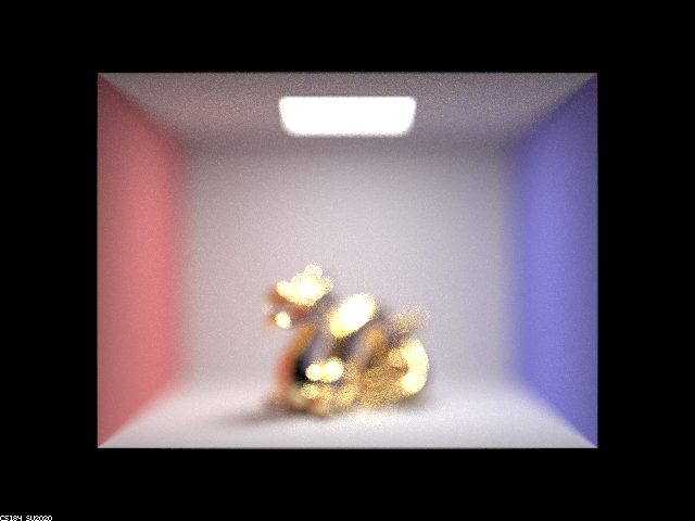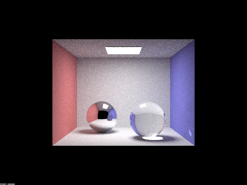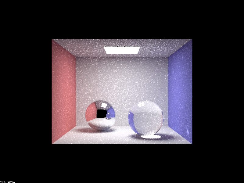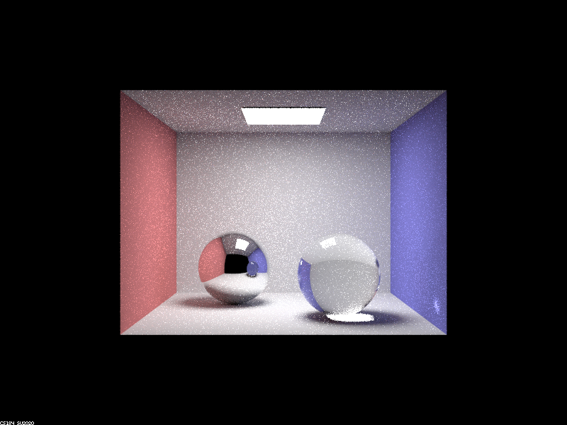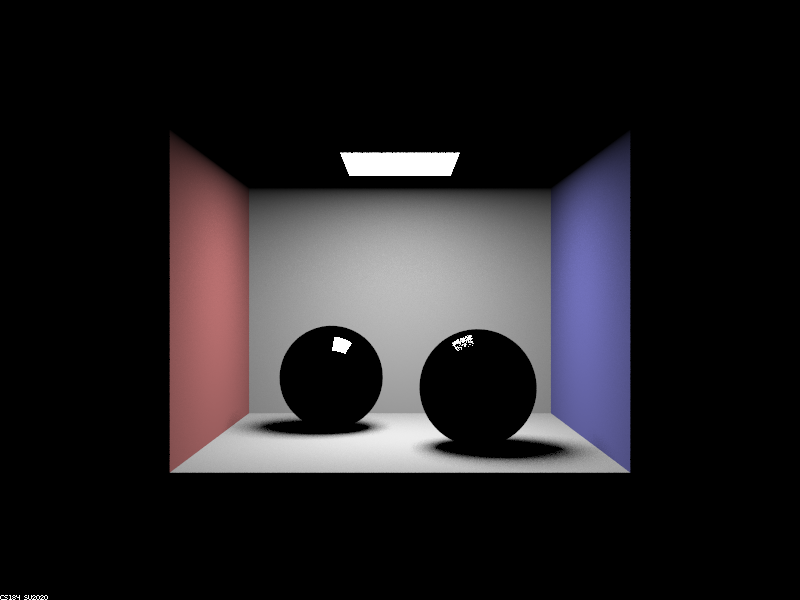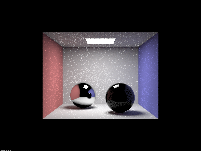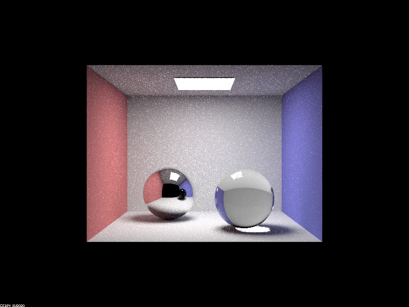 For 0 bounces, we only see the light source since there are no reflections that happen. When we get to 1 bounce, the colors of the room and the light on the black spheres are shown because we’re beginning to see the direct effect of light on its surroundings. Then, at 2 bounces, the room that was “generated” at 1 bounce gets shown in the left mirror sphere, and the right sphere sees small reflective properties. It is only at 3 bounces that we actually see the refractive properties of the right glass sphere, since the light needs to bounce within the sphere first before the light is refracted. At 3 bounces, we can also see the shadow of the glass sphere change according to its refractive properties. At 4 bounces, we see the secondary effects of the refractive sphere, i.e. the left mirror sphere begins reflecting the right spheres refractiveness, and the right wall has a spot of light from the sphere’s refraction. From there, at 5 bounces, if we zoomed in enough, we could perhaps see the right wall’s spot of light’s reflection in the left mirror sphere. However, there are few changes, and the same is true at 100 bounces. It is worth noting that the mirror sphere effectively reflects the changes to its surroundings one “step” late, i.e. changes at 2 bounces would be mirrored in the 3 bounces image.