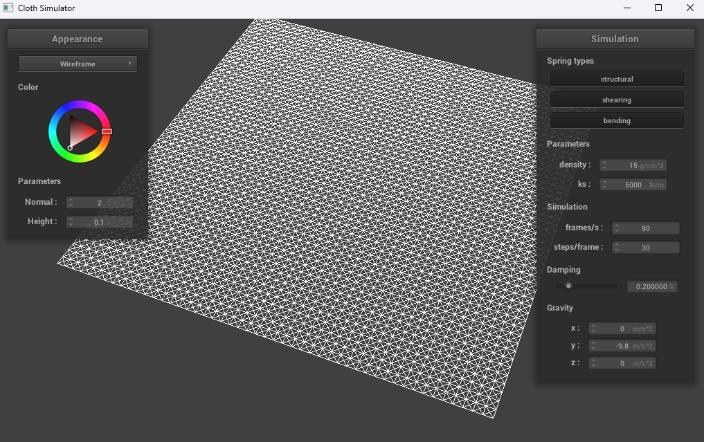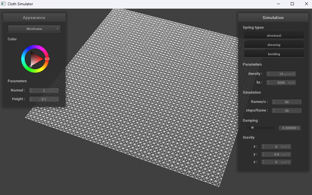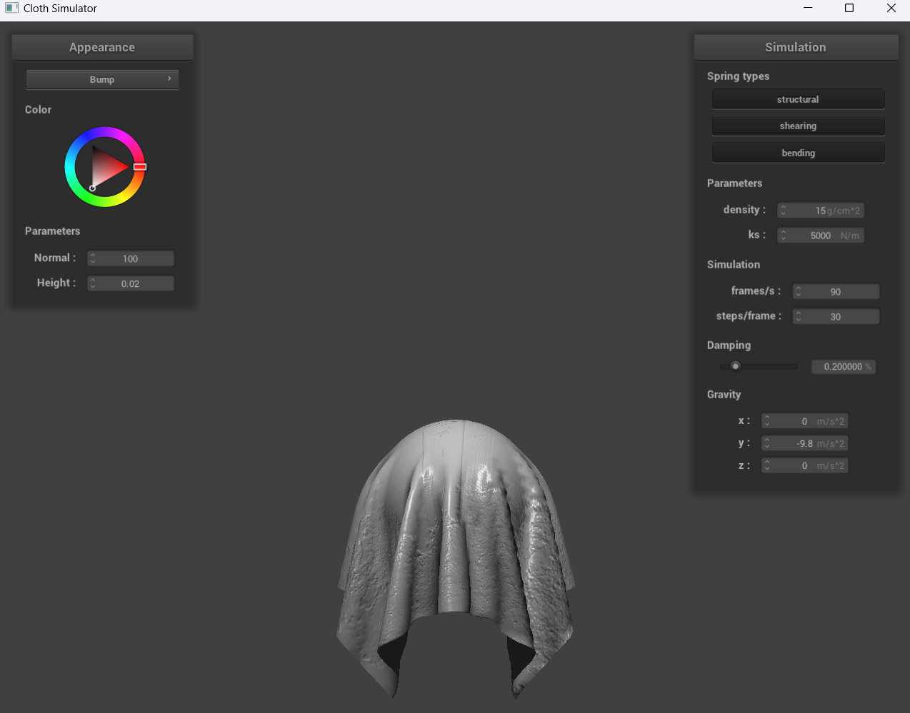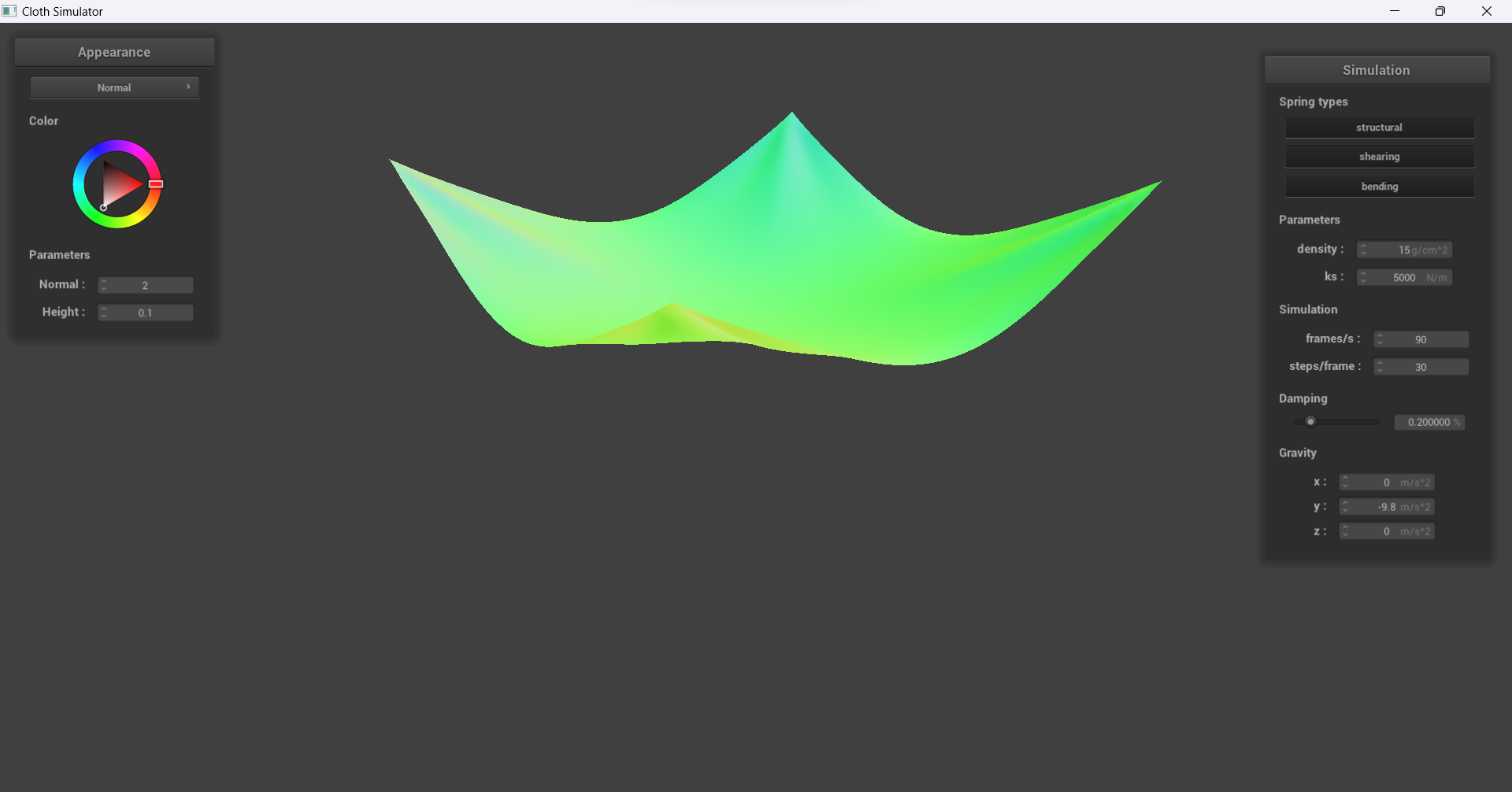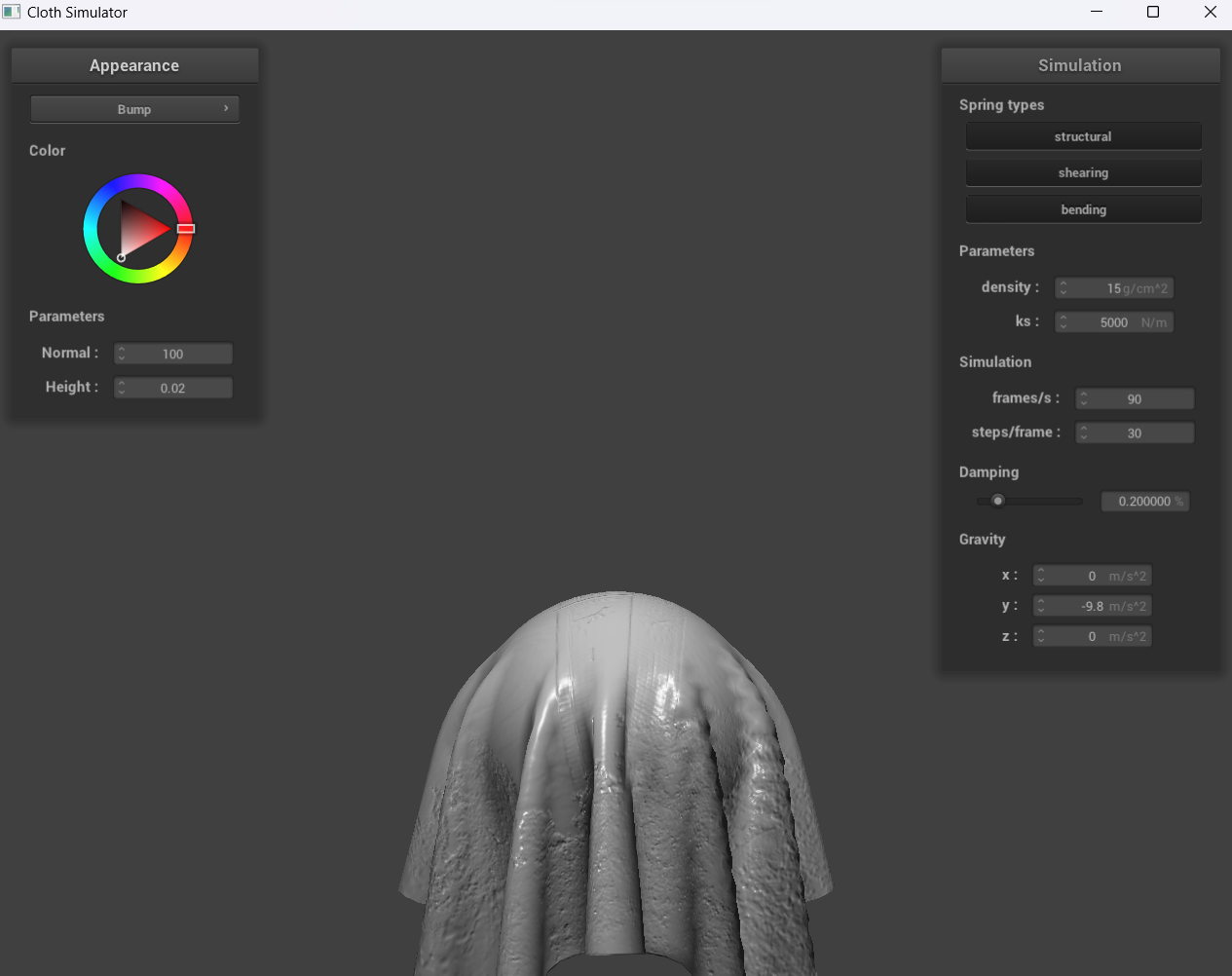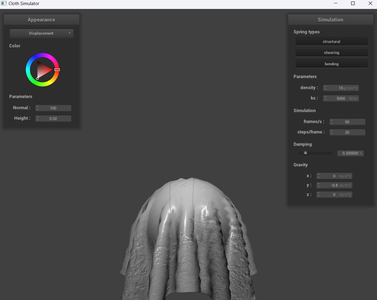 If we change the values of the spring constant ks, we’re changing how different “parts” of the cloth interact with each other. With a very low ks (we took 1 N/m), the spring force between any two given “points” on the cloth is much smaller than the external force(s) on the cloth, meaning that the spring force is almost invisible to the naked eye; this results in a cloth that falls completely flat with no visible creases. In the middle, at the default ks (5000 N/m), we see more of the springs’ effects on the cloth with more self-interactions in the cloth that result in more creases. On the other hand, when we have a very high ks (we took 99999 N/m), the spring forces become much more prevalent and create a “bouncing” effect as the cloth’s “points” continuously experience strong pushing and pulling forces. This results in a much more upright final position, with the cloth sagging less and less as our spring constant increases.
