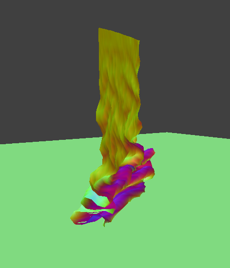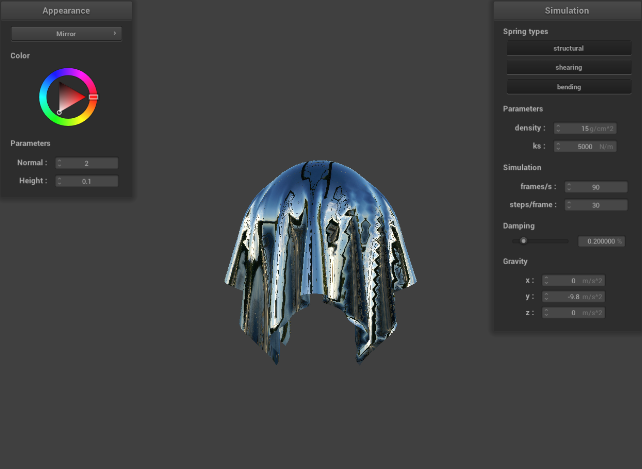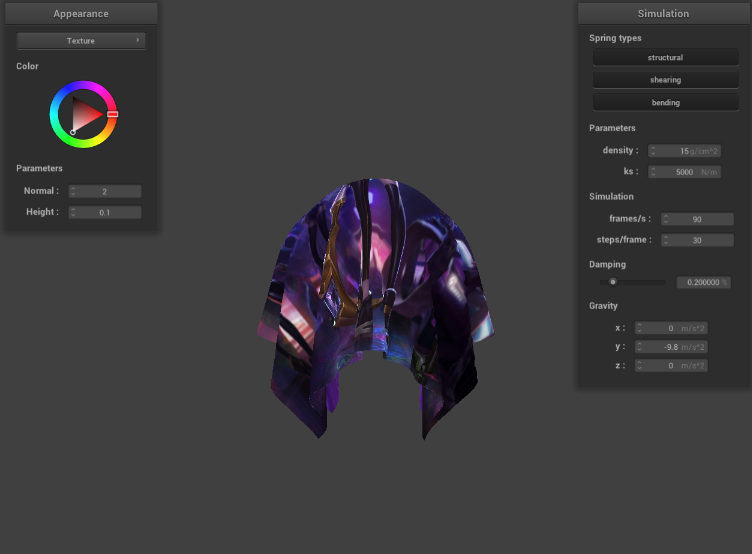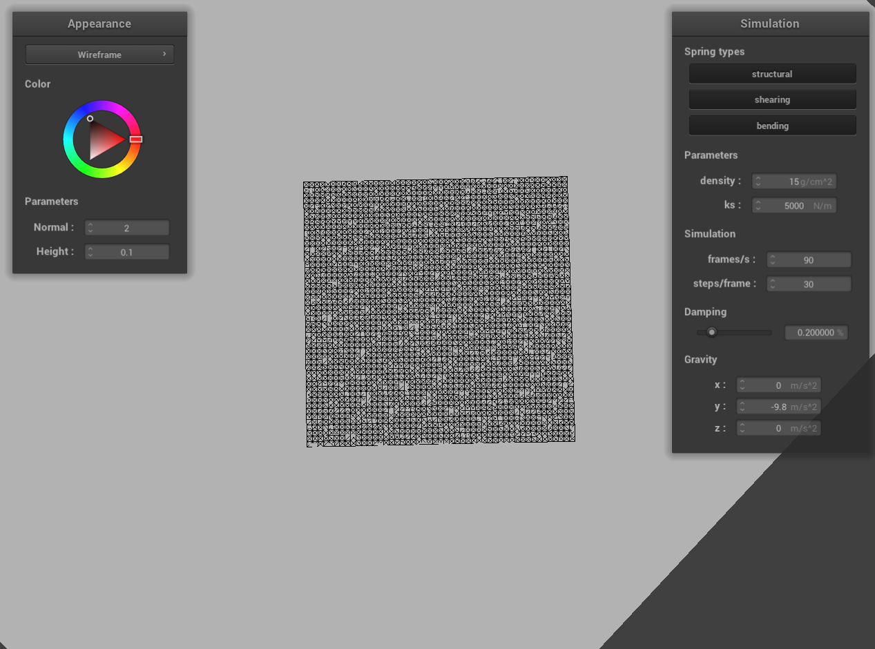 Finally, with damping, we can change how we simulate conservation of energy in our system. With a damping of 0%, our cloth seems to exhibit a model of conservation of energy with no energy lost to heat/friction/sound/etc., so it continues to swing back and forth seemingly endlessly. At a damping of the default 0.20%, we see a more realistic simulation of the cloth falling, as it loses some of its energy to heat/friction/sound/etc., meaning that the potential energy isn’t always fully converted to kinetic energy. This results in the cloth falling to an eventual rest, but not before experiencing some form of a “swinging” back and forth. At a damping of 1%, the cloth falls more slowly since its kinetic energy becomes quickly lost, resulting in it not being able to build up a fast speed. Our cloth here will fall to a resting state on its first “swing” immediately.