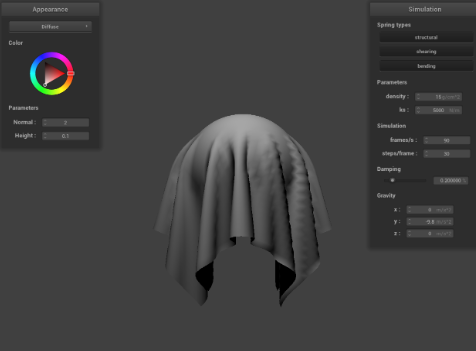 When changing the density, with extremely low densities (like 1 g/cm^2), we have a rather light cloth with light “components,” so we don’t see as many creases. At an intermediate point of density (such as the default 15 g/cm^2), we have more creases since the points experience more forces with their increased density and thus mass. With an extremely high density (99999 g/cm^2), the force of gravity on the “points” of the cloth becomes too great, and so the now-heavy cloth falls flat. Overall, the greater the density, the more the cloth will sag down.