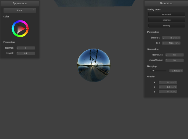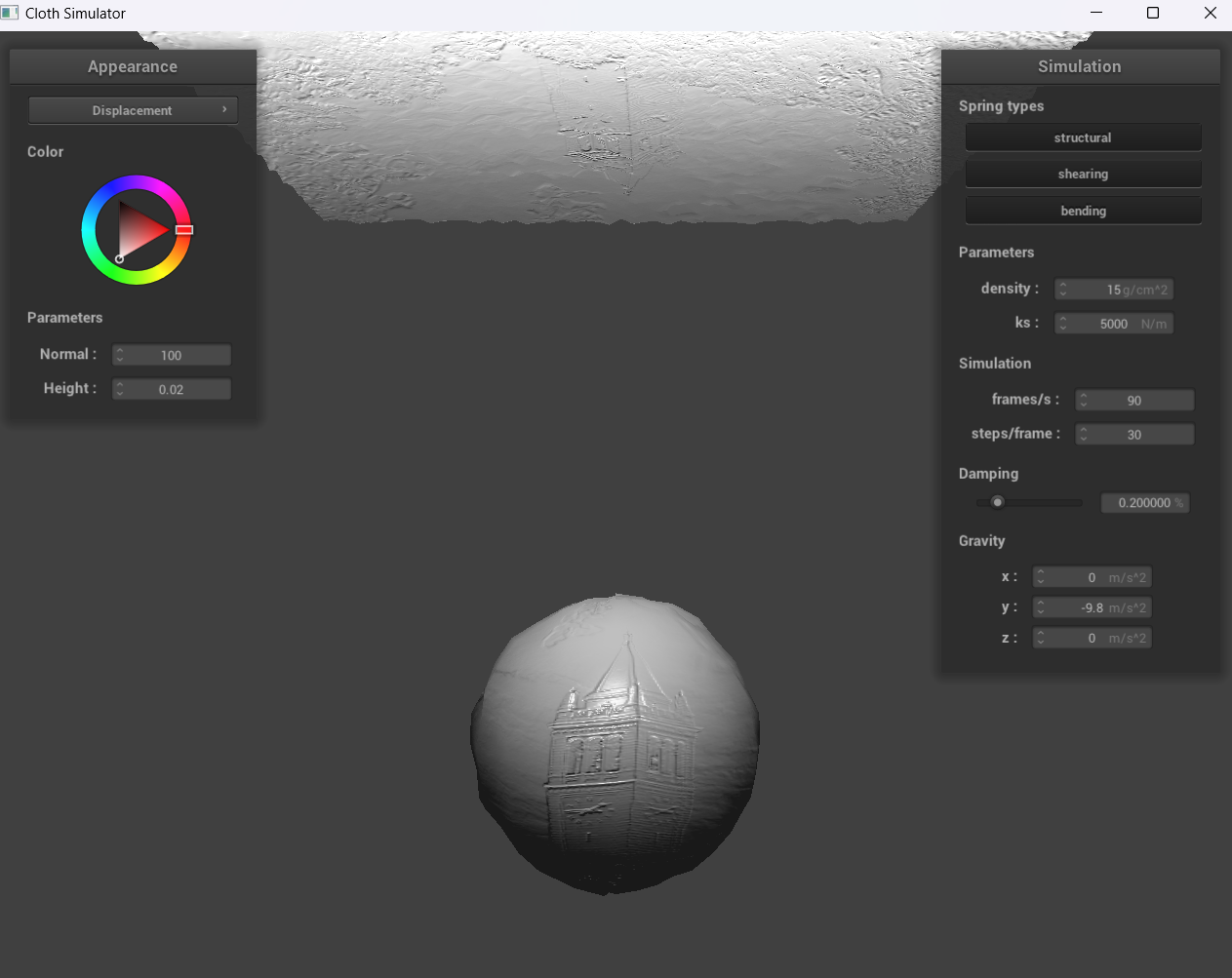 and constrain the positions by not allowing the springs to extend to more than 1.1 times their rest length. In part 3, we handle the way our cloth interacts/collides with spheres and planes by not allowing them to clip through them and instead applying a repellant force upon collision, and we also account for friction. In part 4, we handle self-collision of our cloth in a sped up fashion by hashing our cloth’s points and comparing each point’s location to other points within the same hash region. In part 5, we implement accelerated shaders by implementing diffuse shading, Blinn-Phong shading, texture mapping, displacement/bump mapping, and finally environment-mapped reflections.